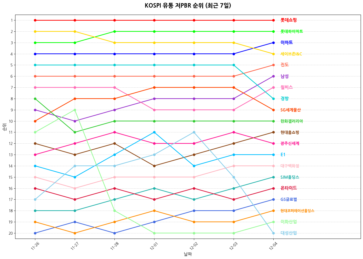 - 저평가 종목 찾기 → 같은 유통 내에서도 PER, PBR이 낮은 종목은 “싸게 사는” 기회가 될 수 있어요
